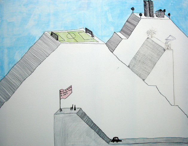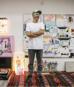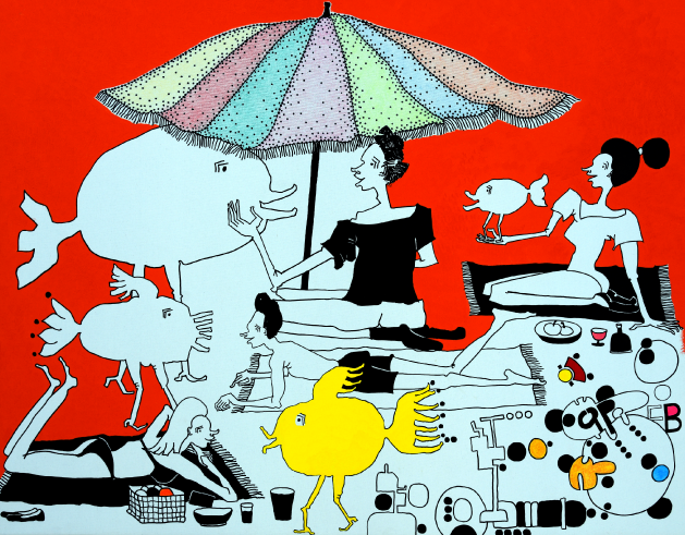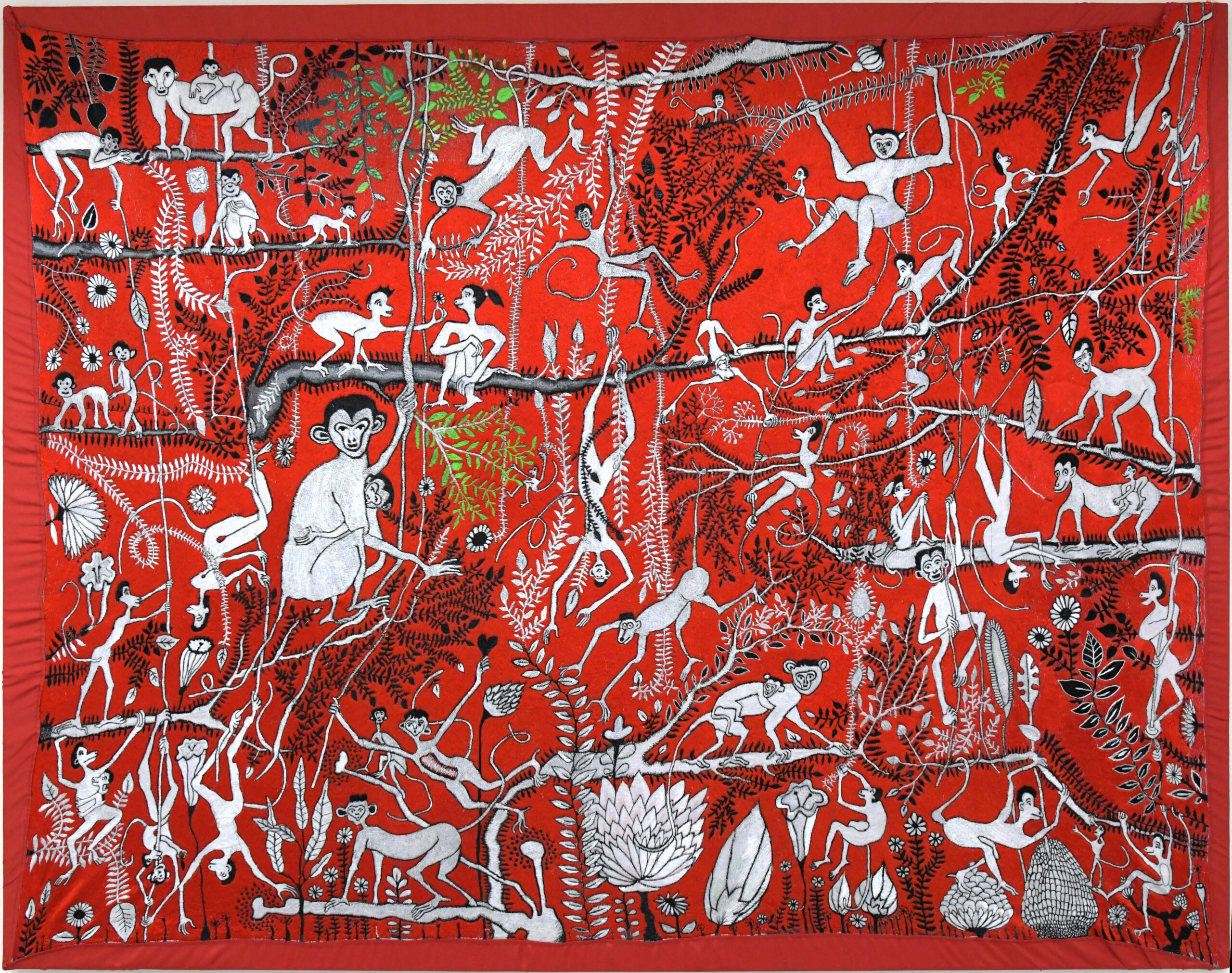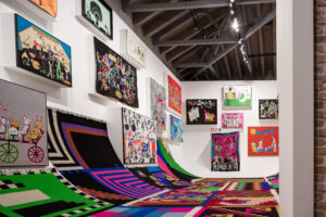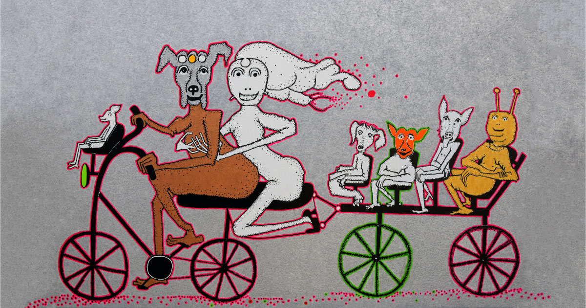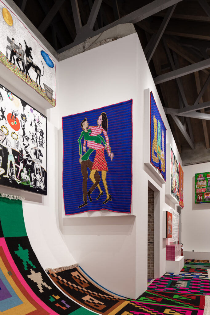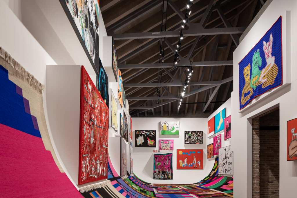 Jakup Ferri presents paintings, embroideries and carpets at the Biennale Arte 2022 – in an exhibition entitled The Monumentality of the Everyday. Ferri’s drawings are mostly depicting everyday scenes involving animals, children, acrobats, musicians, and sports activities (like swimming, snorkeling, bicycling). And then there is this aspect of the vernacular turning into the surreal, or magic, like animals speaking or making music, people turning into birds, people making music for animals or even becoming animals or hybrid creatures. Very often, there’s poetic interactions between people, animals, and objects, looking at each other, thus creating lines of sight – like silent dialogues.